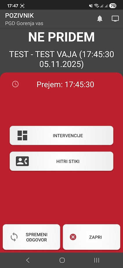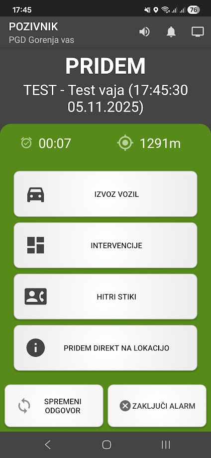 V času aktivne intervencije se na osnovnem zaslonu obarva gumb "POZIVNIK" v barvi našega odziva. Ko je intervencija zaključena na nivoju društva se barvna shema gumb nevtralizira.