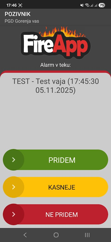 Ob prejetem pozivu se uporabniku odpre telefon z izbiro treh možnosti; zeleno PRIDEM, rumeno, PRIDEM KASNEJE in rdečo NE PRIDEM. Vsaka izbrana možnost pri podrsanju uporabnika sproži določene aktivnosti znotraj sistema FireApp.