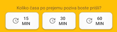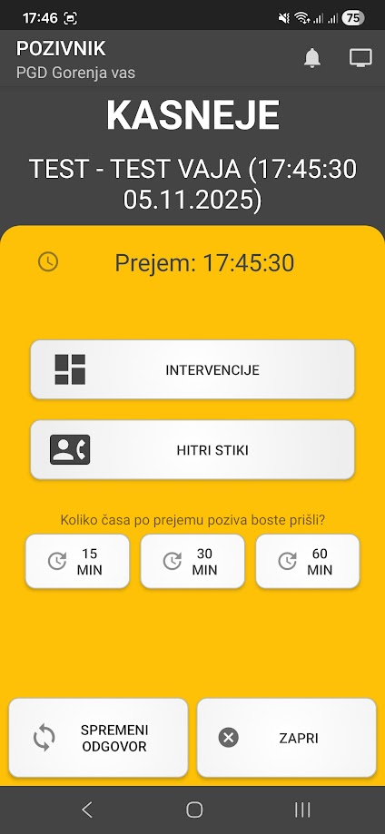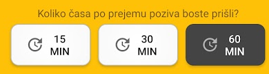 V koliko uporabnik želi poslat v sistem svoj INCIALNI odgovor v kolikšnem času bo na voljo za izvoz v gasilskem domu oz. zbirnem mestu, pa to lahko stori z izbiro ene izmed treh možnosti: 15 min, 30 min in 60 min.