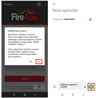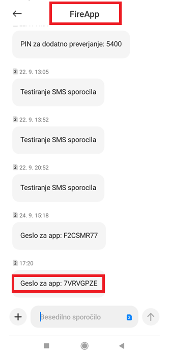 od pošiljatelja FireApp prejelo novo SMS sporočilo z generirano kodo: