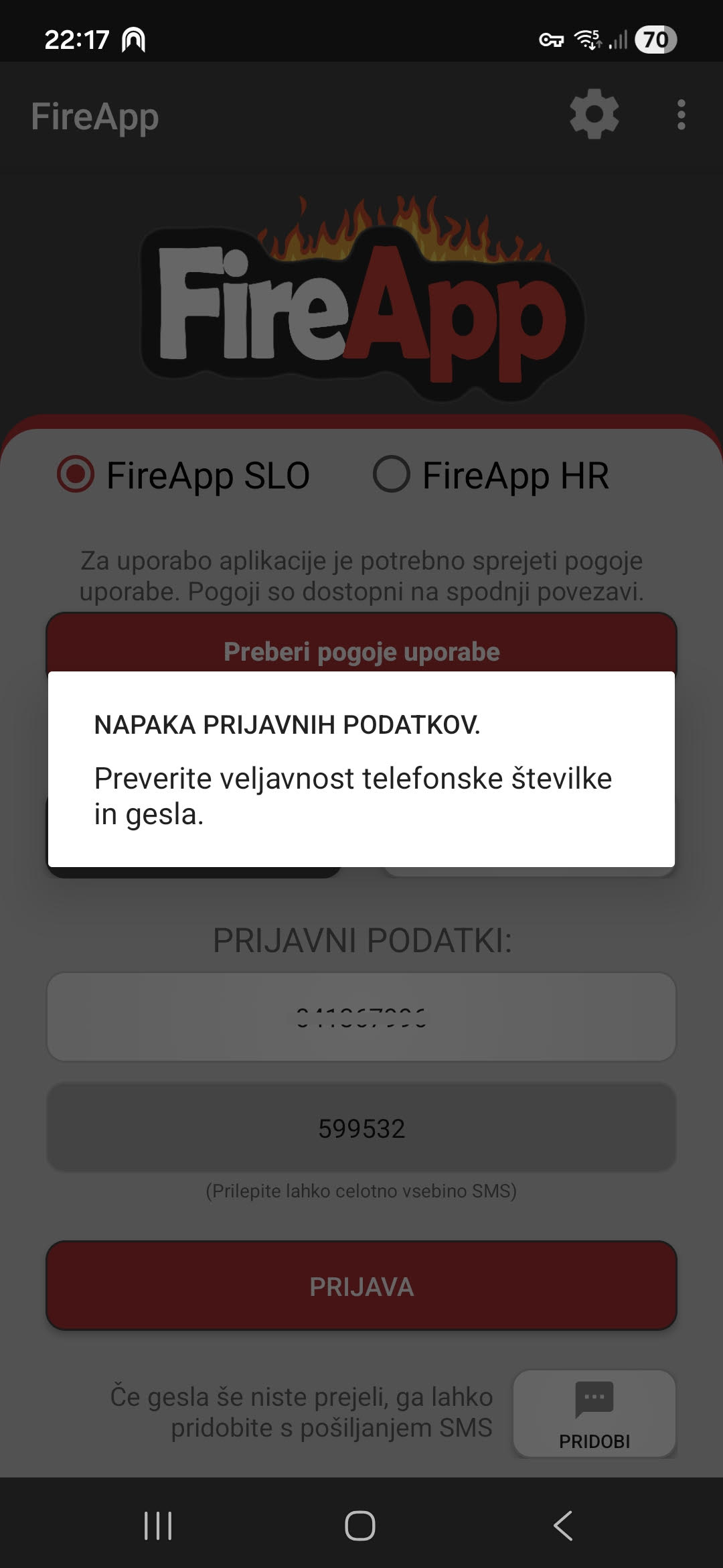 Ob vpisu telefonske številke in gesla v aplikacijo se izpiše napaka: