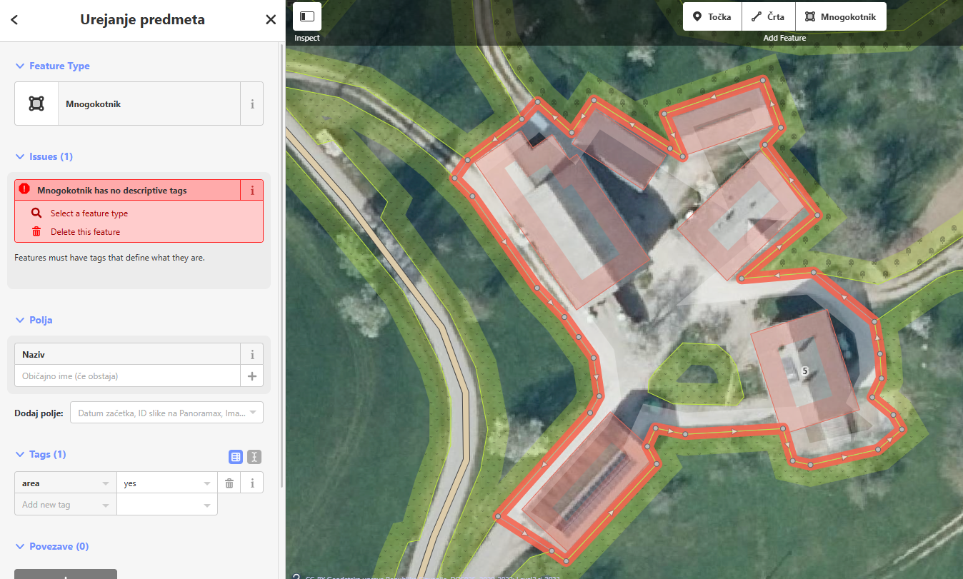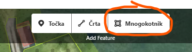 Če tega na območju še ni vzpostavljenega se postavimo na željeno območje in imamo na zgornjem delu zemlejevida možnost izbire točke, črte in mnogokotnika. Izberemo ''Mnogokotnik'':